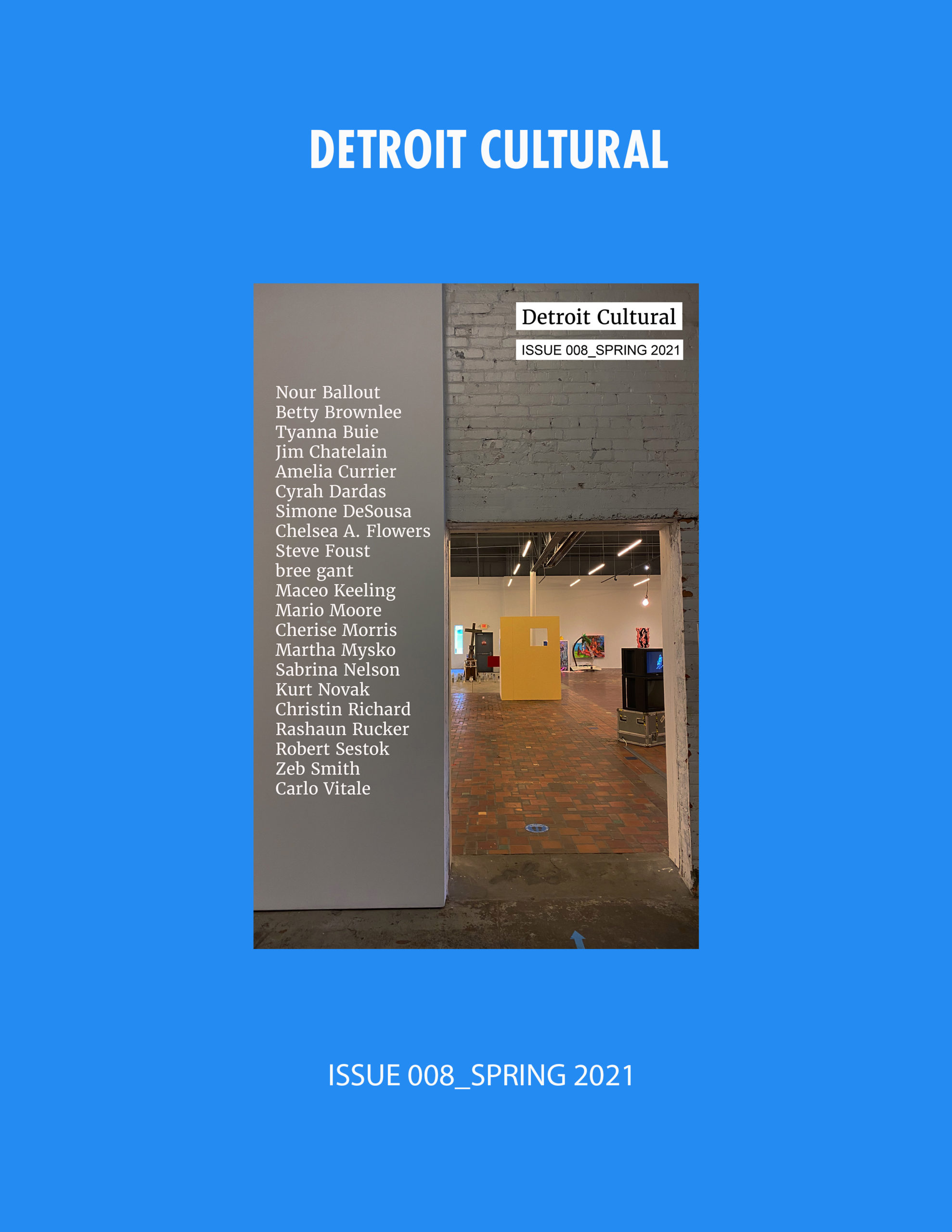 ISSUE 008_SPRING 2021 is framed around the idea of collaboration, and focuses on the Dual Vision exhibition currently on view at the Museum of Contemporary Art Detroit. Dual Vision includes over forty artists either living or connected to Detroit whom have been paired off for the purpose of creating new, collaborative works. In this issue we feature interviews with twenty of the artists, as well as an interview with members of the curatorial team. Interviews with the artists were designed in a questionnaire format, in which each artist is answering the same set of five questions that explore the concept of collaboration and the possibilities offered through it that are unavailable to people working individually.